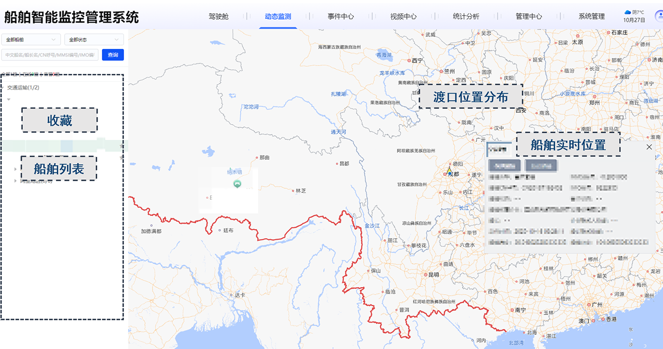 1)动态监测:平台提供全域船舶实时定位并展示船舶在线状态,支持快速检索重点关注船舶并对船舶进行轨迹回放。